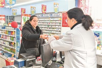 日前,在安徽省铜陵市一家药店内,外籍人士使用外国人来华工作许可证与社会保障卡融合集成实体卡刷卡购物。储著传摄(人民视觉)