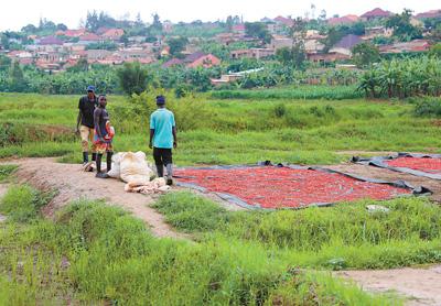 卢旺达是首个向中国出口干辣椒的非洲国家,受惠于非洲农产品输华“绿色通道”等举措和零关税政策,卢旺达干辣椒已实现稳定对华出口。图为卢旺达首都基加利的农户在晾晒辣椒。新华社记者 吉莉 摄