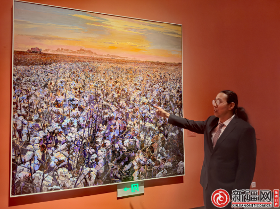新疆艺术学院美术学院教师马勇介绍自己的作品《新疆棉——沃野》(薛玲摄)