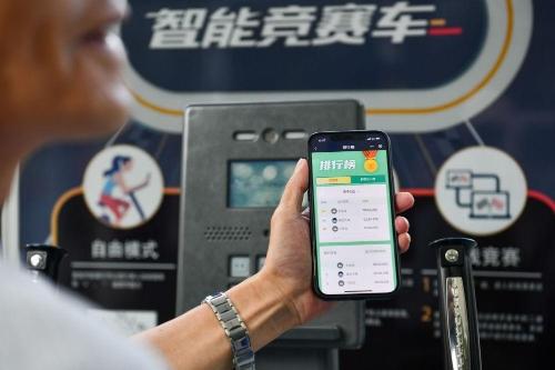 2024年1月20日,一位市民在骑行结束后展示个人成绩。新华社记者 梁旭 摄
