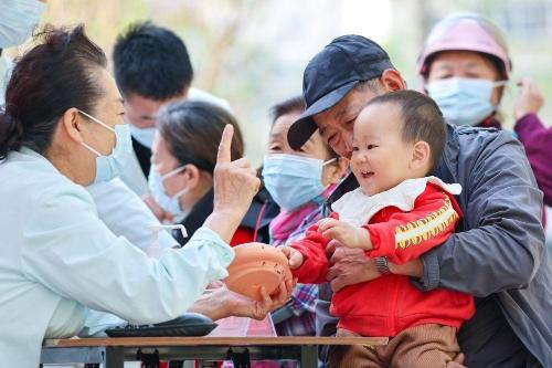 4月7日,河北省石家庄市桥西区裕西社区卫生服务中心的医护人员为小朋友进行身体健康检查。新华社发(张晓峰摄)