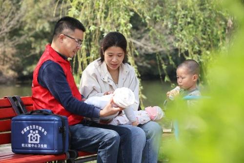4月7日,浙江省湖州市德清县乾元镇中心卫生院家庭医生、浙江省基层名中医王红武(左)在联星中心村体育休闲公园,指导宝妈进行婴幼儿中医推拿按摩保健。新华社发(倪立芳摄)