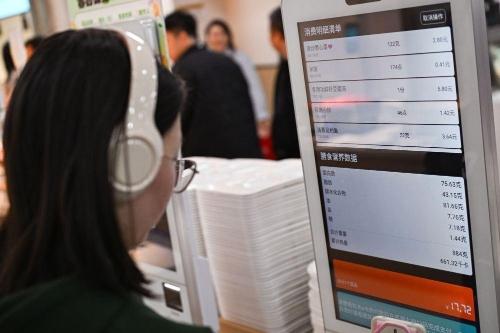 3月21日,在中国农业大学东校区,一名学生查看“智慧食堂”设备上的餐食营养数据信息。新华社记者 陈钟昊 摄