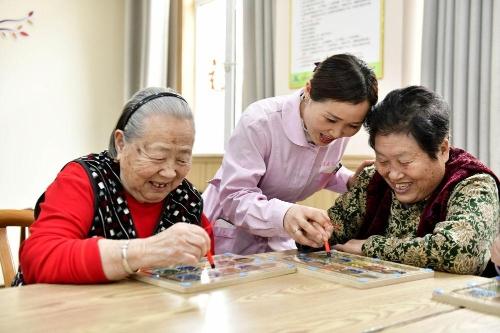3月13日,在郓城县潘渡镇诚信医养中心,工作人员在陪老人做游戏。新华社记者 郭绪雷 摄