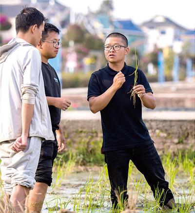 云南勐海县勐遮镇曼恩村,云南大学农学院青年教师黄光福(右)在稻田中给学生授课。新华社记者 彭奕凯 摄