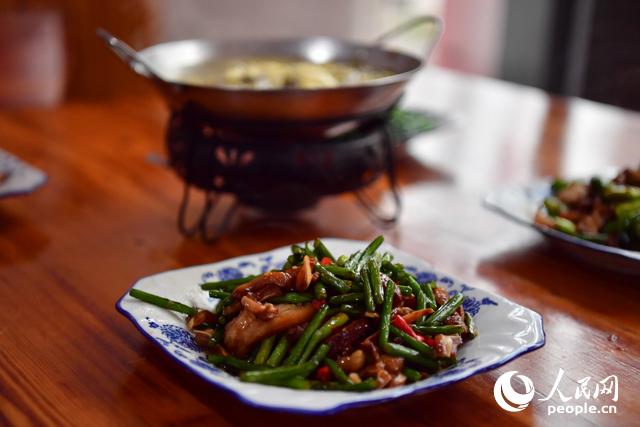 后厨中,乐平市程新村村民周尚元一人熟练操作着三个灶台。热锅起油,加入葱姜、大蒜、辣椒,倒入主菜,猛火颠炒。不一会儿,藜蒿炒腊肉、蒜苗炒猪耳、辣椒炒肉等一道道色香味俱佳的江西小炒便陆续出锅。