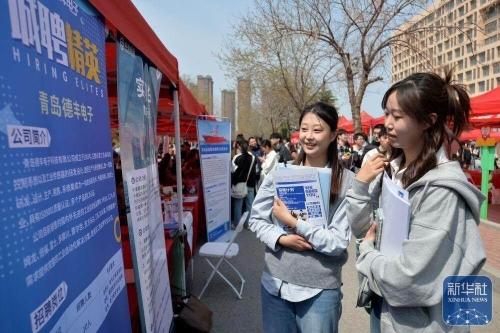 ↑ 4月11日,学生在山东青岛科技大学2025年春季综合类大型双选会招聘活动现场查看企业资料。新华社发(王海滨摄)