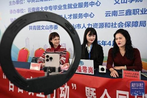 ↑ 4月9日,工作人员在云南省文山学院招聘会现场进行“直播带岗”。新华社发(熊平祥摄)