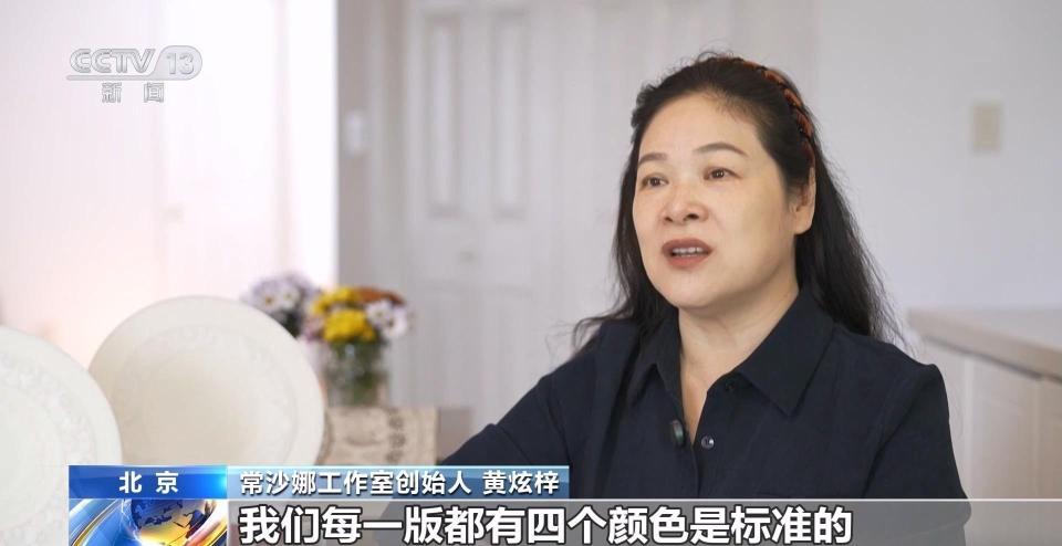 常沙娜工作室创始人 黄炫梓:我们每一版都有四个颜色是标准的,以中国的传统图案的色彩色调来的,是根据敦煌莫高窟历朝历代对于颜色深中浅的概念的截取。