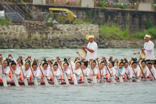 4月13日,在西双版纳傣族自治州景洪市,人们参与传统龙舟表演赛。 新华社记者 高咏薇 摄