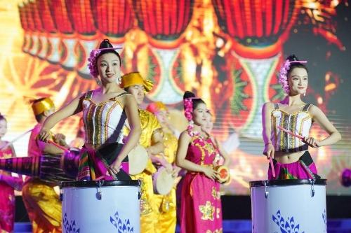 4月12日,在西双版纳傣族自治州景洪市,演员在傣历新年节(2025年泼水节)文艺晚会上表演。新华社记者 高咏薇 摄
