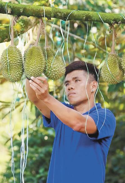 4月,正是榴莲花开的时节。距离马来西亚首都吉隆坡两小时车程的彭亨州劳勿县,果农忙着为榴莲树剪枝、授粉。90天后,瓜熟蒂落的榴莲将被装船越洋,走进中国消费者的购物车。