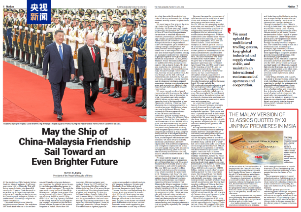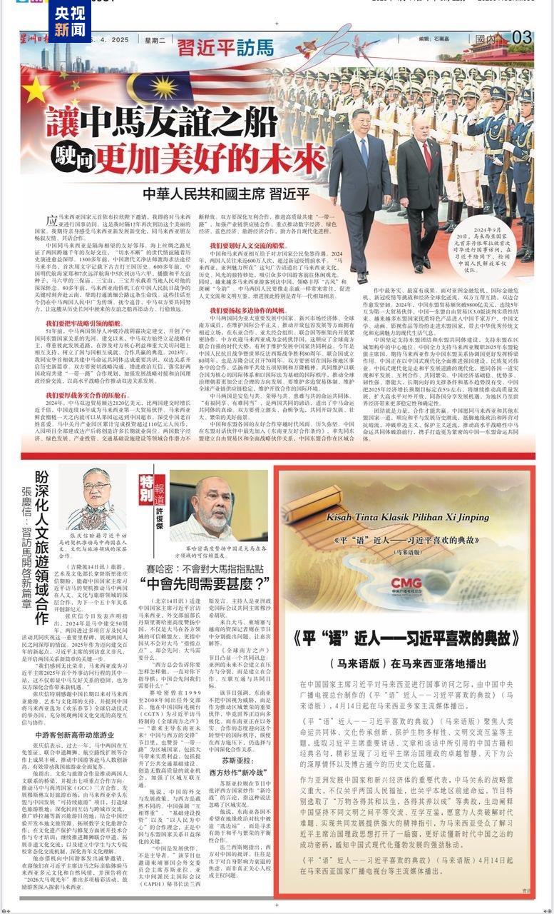 在中国国家主席习近平对马来西亚进行国事访问之际,4月15日,由中国中央广播电视总台制作的《平“语”近人——习近平喜欢的典故》(马来语版)启播仪式在吉隆坡举行。马来西亚第一副总理扎希德发来贺信,祝贺节目在马来西亚播出。包括马政治、经济、文化、媒体、学术等各界知名人士在内的200余名嘉宾出席活动。