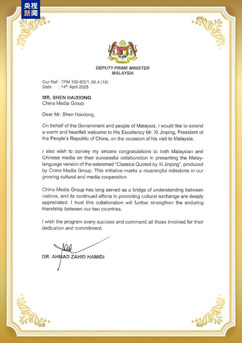 扎希德第一副总理在贺信中热烈欢迎习近平主席访问马来西亚。他表示,中国中央广播电视总台的精品节目《平“语”近人——习近平喜欢的典故》(马来语版)在马来西亚启播是马中两国不断深化文化与媒体交流合作的又一重要里程碑。中央广播电视总台一直以来都是促进国家间相互理解的桥梁和纽带,相信这次合作将进一步加强马中两国长期以来的友好关系。