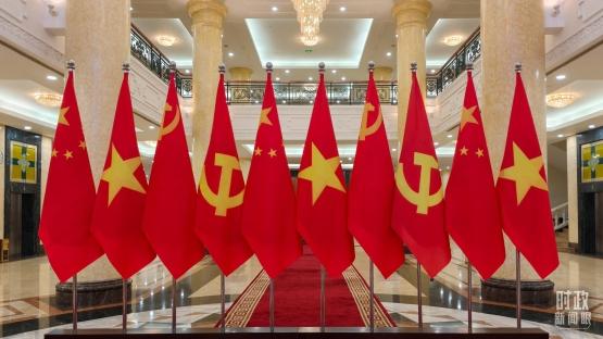 △欢迎宴会现场摆放的中越两国国旗。(总台央视记者鄂介甫拍摄)