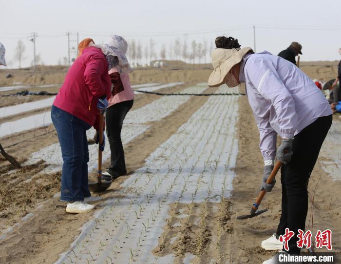 近日,和田地区民丰县沙漠实验田,村民正在为洋葱培土。陶拴科 摄