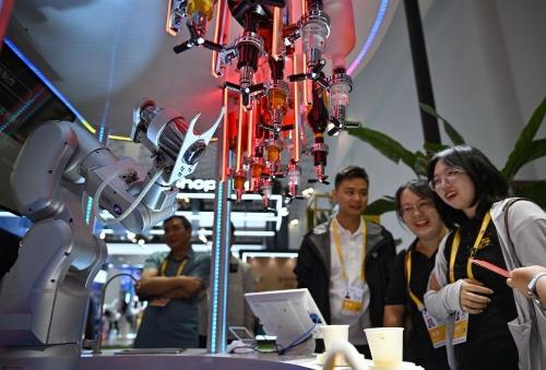 新华社照片,海口,2025年4月14日。4月14日,消博会上展示的一款机器人在调酒。第五届中国国际消费品博览会聚焦未来科技,各式各样的机器人纷纷亮相,以前沿科技实力与创新应用,勾勒出未来生活的全新图景。新华社记者 郭程 摄