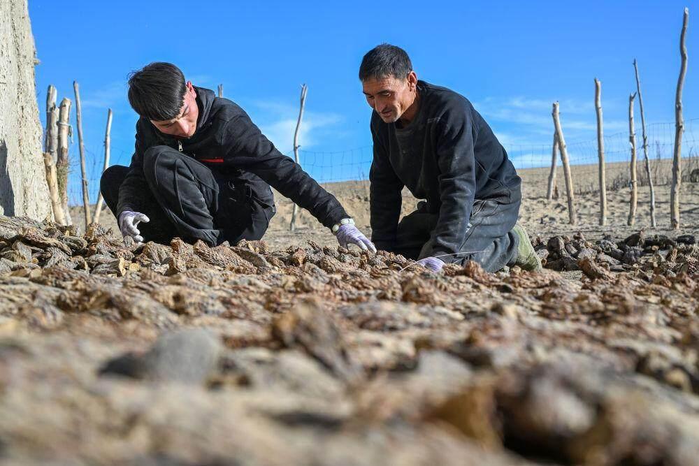 2024年11月6日,达里雅布依村村民晾晒肉苁蓉。新华社记者 陈朔 摄