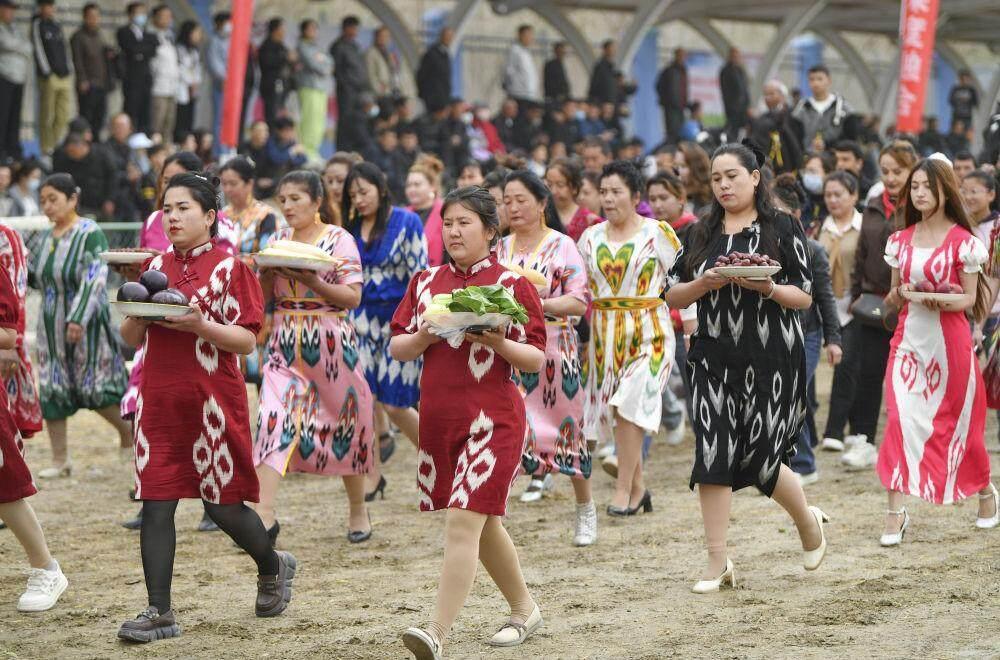 4月12日,参赛代表队捧着本乡的农产品在开幕式上入场。新华社记者 胡虎虎 摄