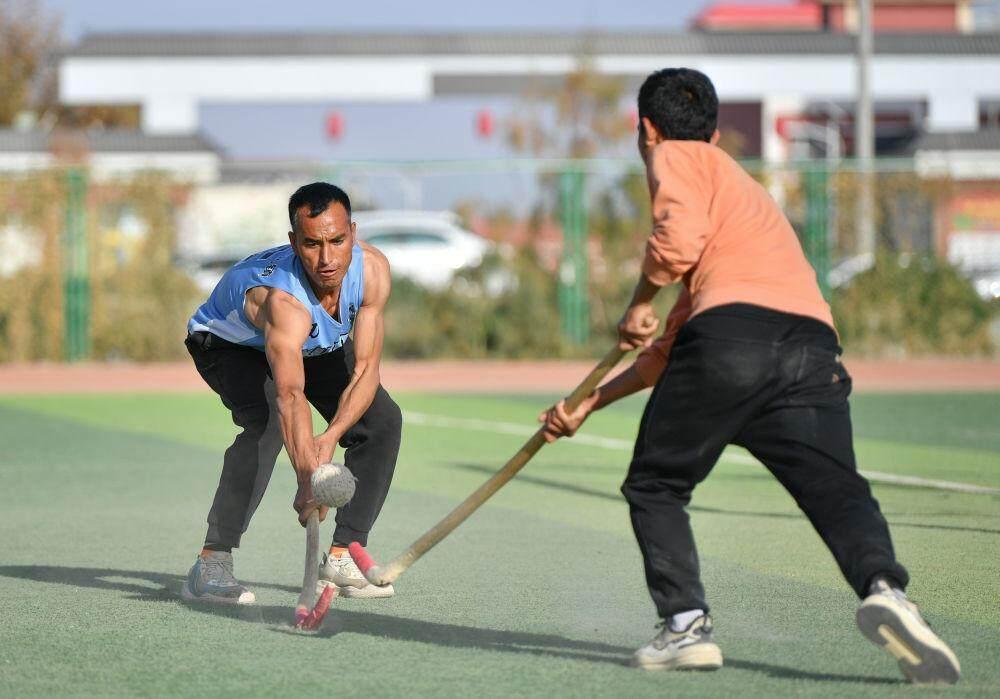 2024年11月8日,在新疆于田县体育场,阿卜杜拉艾孜则·阿卜杜海娃尔(左)和队友在训练中拼抢。新华社记者 胡虎虎 摄