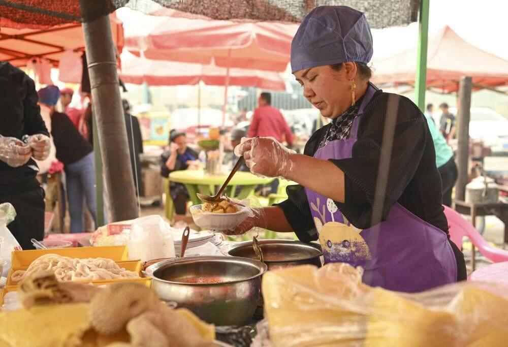 4月13日,一位商贩在新疆于田县先拜巴扎镇农牧民运动场为顾客制作面食。新华社记者 胡虎虎 摄