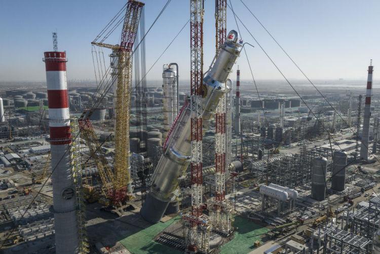 2月26日拍摄的华锦阿美精细化工及原料工程项目芳烃联合装置抽余液塔吊装施工现场(无人机照片)。新华社记者 潘昱龙 摄