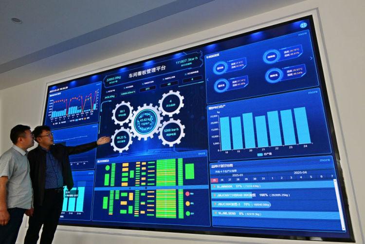 在山东省青岛市即墨区龙山街道一家服装企业的车间看板管理平台,工作人员在实时查看相关数据(3月25日摄)。新华社记者 李紫恒 摄