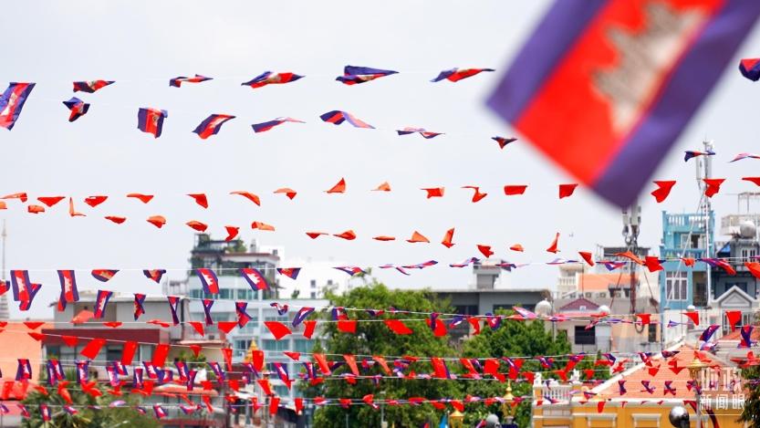 △金边街头悬挂的中柬两国国旗。(总台央视记者卢心雨拍摄)