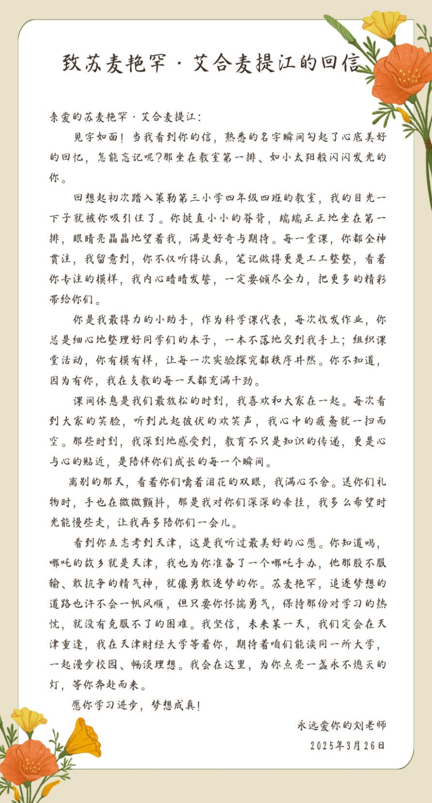 天津财经大学的教室里,阳光透过窗户洒在桌上,曾经参与援疆支教的刘闻宣正仔细阅读着苏麦艳罕的信件,嘴角不自觉地上扬。这封信,字里行间满是思念与成长的欣喜。