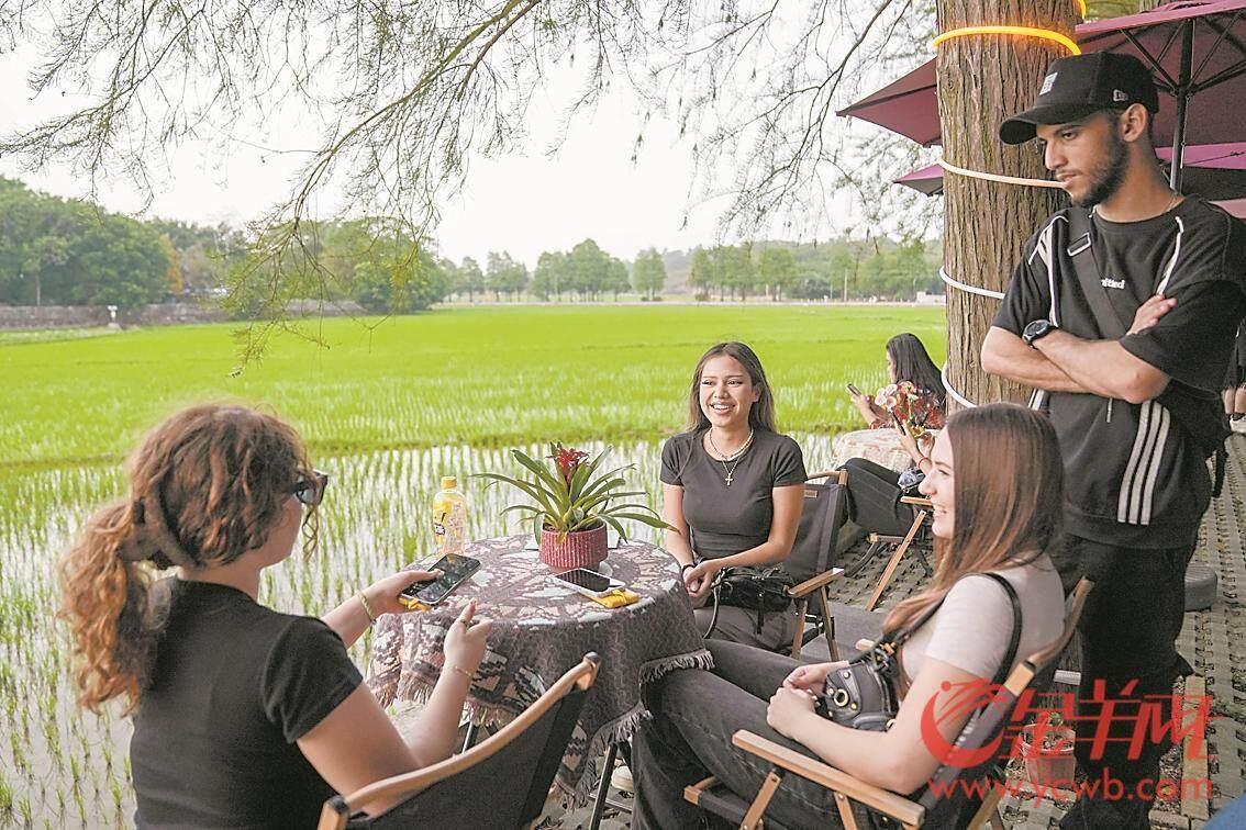 外国游客在崖口村稻田旁的咖啡店座位上欣赏美景