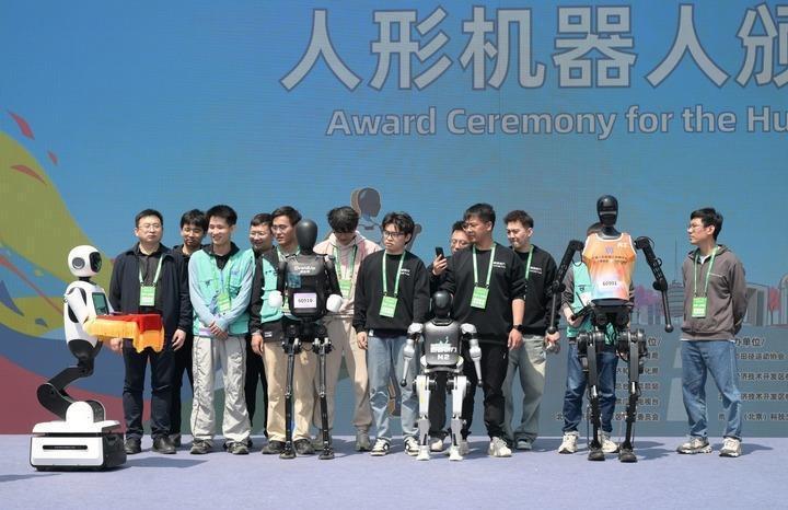 2025年4月19日,一台机器人在人形机器人颁奖仪式上托举着奖牌走向获奖机器人选手和技术团队。当日,2025北京亦庄半程马拉松暨人形机器人半程马拉松举行。新华社记者 李贺 摄