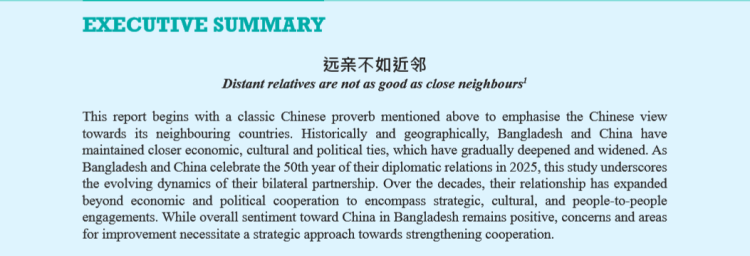 报告说,75%的受访者对孟加拉国与中国的关系持正面看法,与此同时,仅2%的受访者对华关系持负面看法。