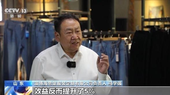 淄博海思堡服装定制有限公司负责人 马学强:牛仔服装的价格不降反升,相比原先出口美国市场,效益反而提升了5%。