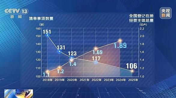 从2018年我国首版市场准入负面清单出台到现在,共经历四次修订,清单事项数量由2018年的151项压减至目前的106项,压减比例约30%。与准入事项不断下降的曲线相对应的,是一条快速增长的经营主体总量曲线,从2018年起,全国经营主体增长超过了70%。越缩越短的清单,越放越活的市场,正映射出中国经济的巨大潜力。