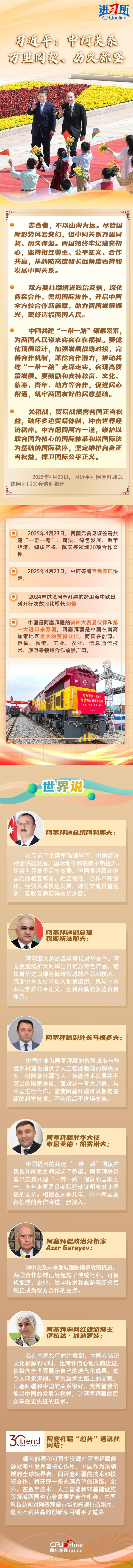 4月23日,中国国家主席习近平在北京同阿塞拜疆总统阿利耶夫举行会谈。两国元首宣布,建立中阿全面战略伙伴关系。习近平指出,尽管国际形势风云变幻,但中阿关系万里同契、历久弥坚。双方要持续增进政治互信,深化务实合作,密切国际协作,开启中阿全方位合作新篇章,助力两国发展振兴,更好造福两国人民。