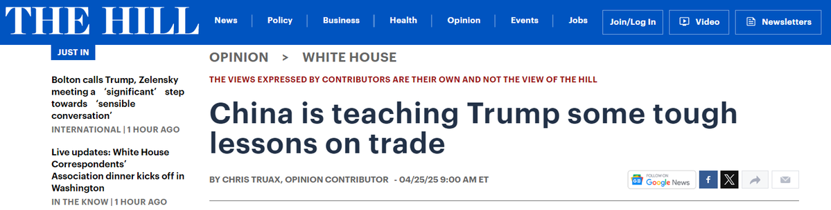 中国日报网4月27日电 美国《国会山报》网站4月25日刊发专栏文章称,美国试图通过高额关税迫使中国屈服的贸易策略,正以惊人的速度走向失败。中国在贸易问题上给特朗普上了严厉的一课。这场贸易战,不仅未能动摇中国,反而激发了中国新的国家使命感。