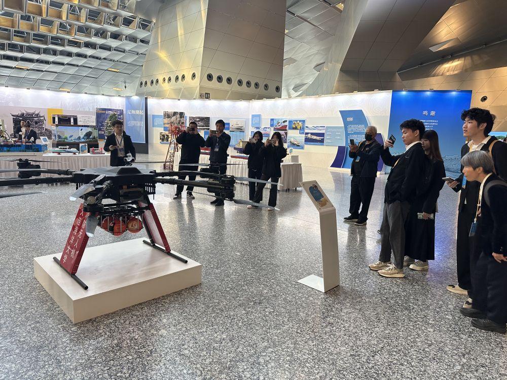 在大连国际会议中心船政历史展览厅内,台湾同胞参观由大连海洋大学自主研发的大载重无人机(4月23日摄)。新华社记者 李妍 摄