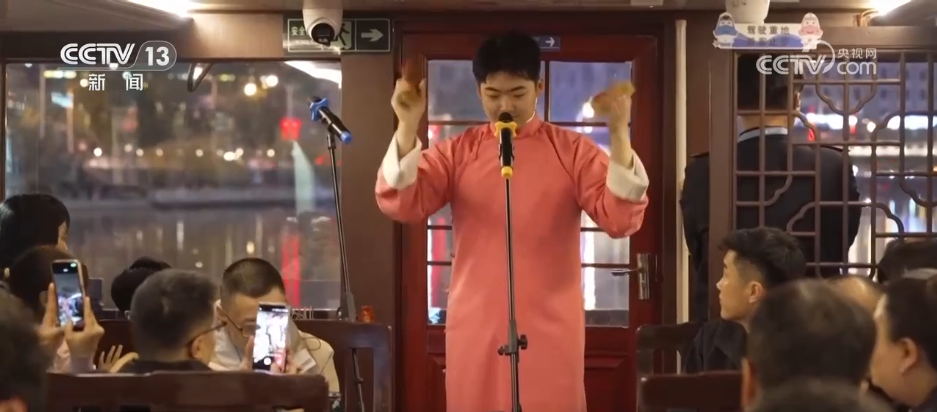 这段快板可不是在传统的茶馆里,而是在海河的游船上。这是最近在天津特别火的旅游项目,相声主题游船特邀津门曲艺名家登船献艺,将传统相声与海河风光巧妙融合,游客在欣赏两岸美景的同时,又可以感受曲艺的魅力,可谓一举两得。游客说:“在游船上听相声是不一样的体验,上了游船,站在甲板上,看着两边的霓虹灯光,特别惬意。”