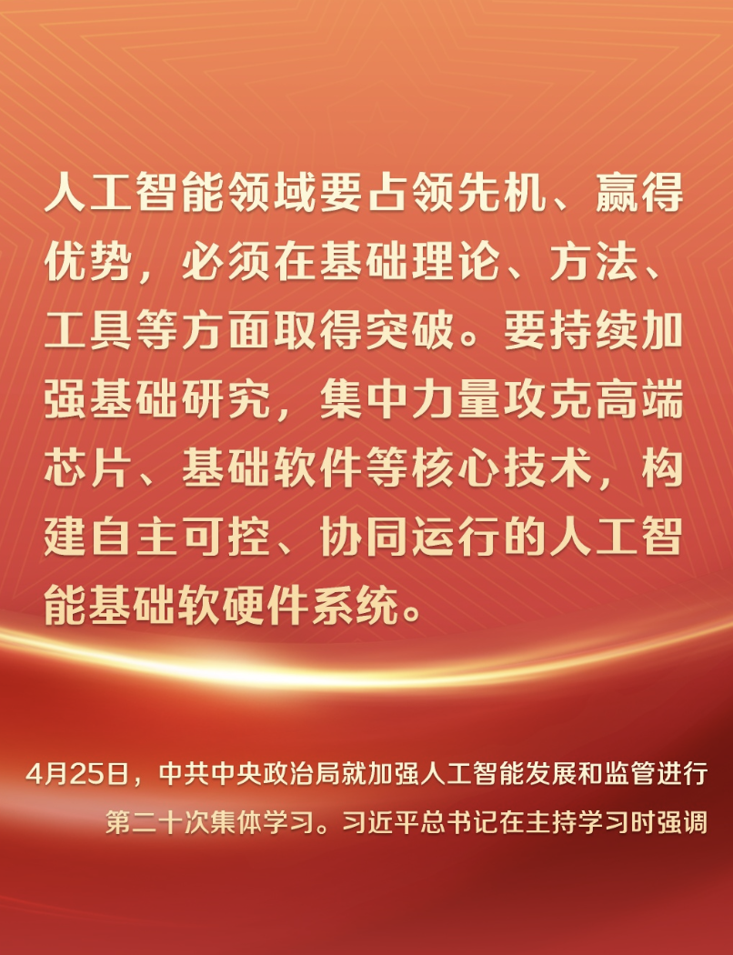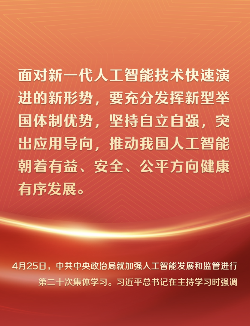 就在4天前,4月25日下午,中共中央政治局就加强人工智能发展和监管进行第二十次集体学习。习近平总书记在主持学习时强调: