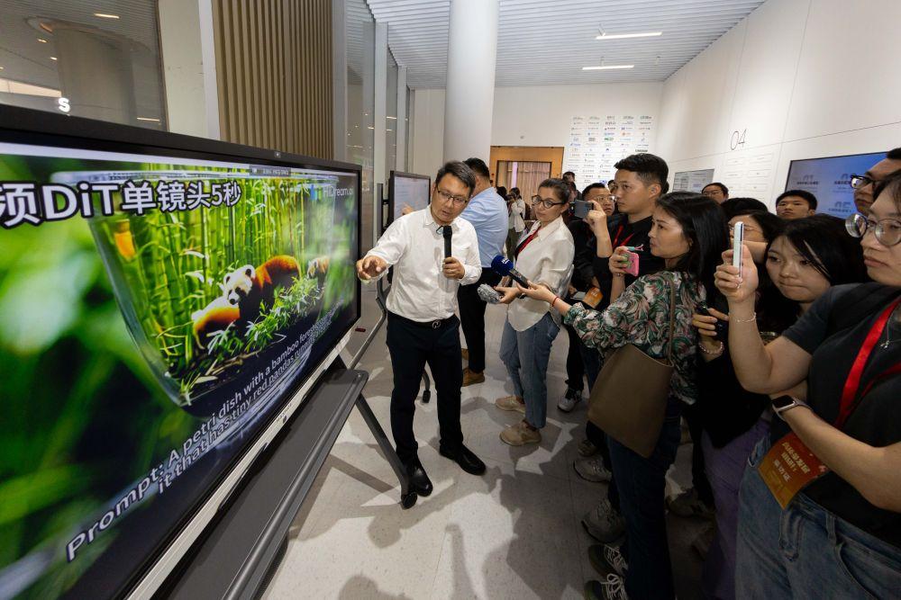 2024年5月23日,在“模速空间”,工作人员为采访团介绍运用大模型文生视频。
