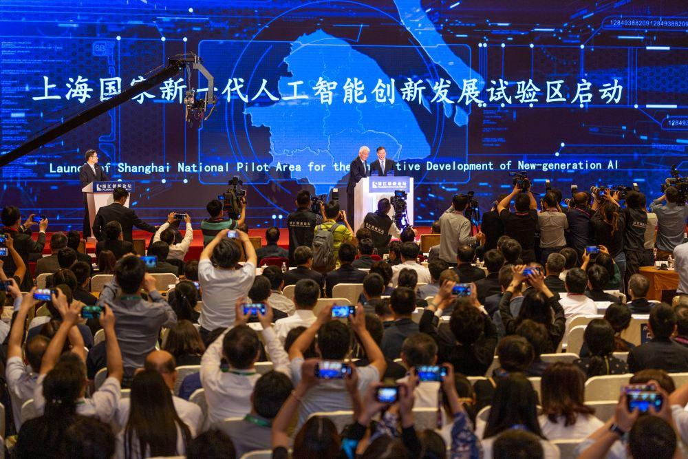 在上海举行的2019浦江创新论坛全体大会上,科技部与上海市政府共同启动上海国家新一代人工智能创新发展试验区建设(2019年5月25日摄)。
