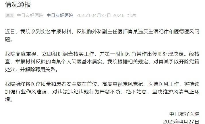 近日,北京中日友好医院通报胸外科副主任医师肖某违反生活纪律和医德医风问题一事基本属实,医院果断对其解除聘用关系。这一事件引发了公众对医疗行业诸多问题的深入思考,尤其是对医学教育机制和教育公平的深刻反思。