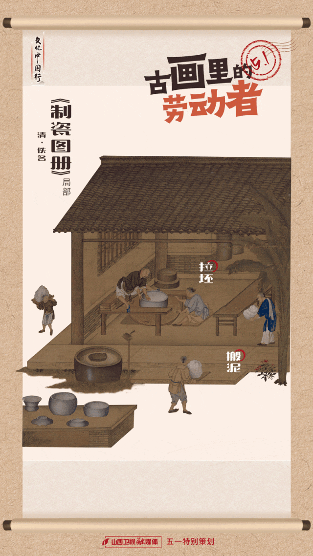 制瓷图册:清代佚名作,绘制了古代烧造瓷器的主要过程,包括练泥、拉坯、晒坯、刻花、施釉等,清晰地再现了瓷器烧造技艺工序。