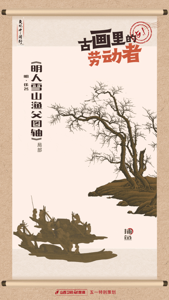 明人雪山渔父图轴:明代佚名作,描绘寒江捕鱼情景,柳条枯枝横斜,岸边渔夫辛勤劳作。画幅中部四艘蚱蜢小舟两两并行,以竹排相连,上架转轴机械,渔夫转动机轴徐徐收网。生动再现了渔夫合作捕鱼场景。