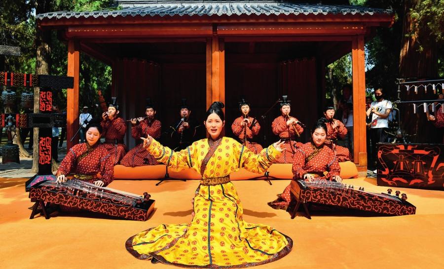 在曲阜孔庙,孔子博物馆礼乐传习所的工作人员进行以《诗经》为主题的雅乐表演(2023年6月27日摄) 郭绪雷摄