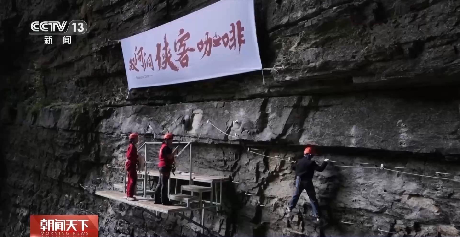 眼下,越来越多的溶洞变身为新的消费场景,洞穴图书馆、洞穴探险旅拍,攀岩飞拉达等新的消费业态逐渐增多。戴好头盔和防护装备,从悬崖峭壁一路攀登至80米高的悬崖边上,再品尝这杯“悬崖咖啡”,这样别致的冒险体验,一经推出就火爆出圈。