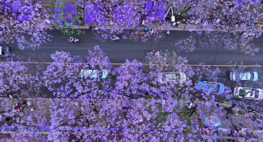 “五一”假期,昆明市教场中路延绵的紫色花海盛开。