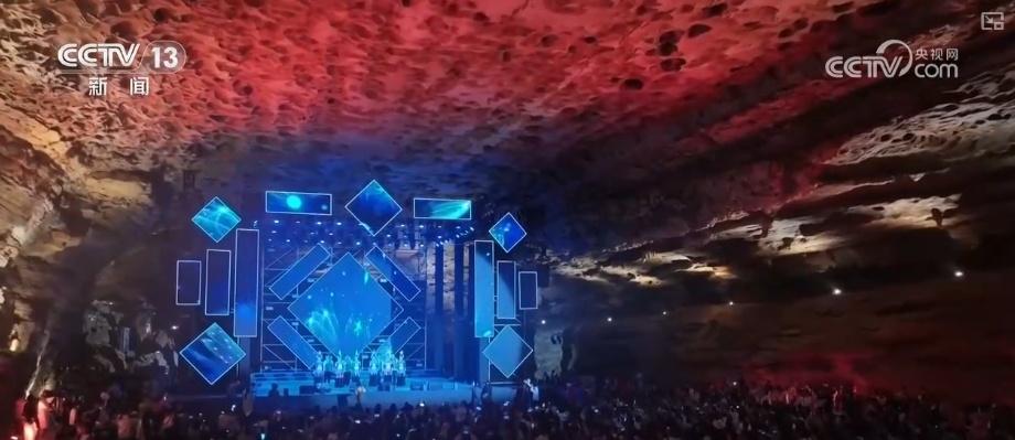 贵州省绥阳县温泉镇,当地溶洞喀斯特地貌资源丰富。假期里,当地将音乐会首次“搬进”了溶洞。专业音响系统被布置在钟乳石群间,使音乐既能保留原声质感,又能叠加洞穴独有的空灵回响。洞中主舞台还引入了全息投影技术,将银河系动态光影投射在亿万年形成的洞顶岩壁上,随着音乐节奏变换出星河、极光等视觉效果,营造“地心音乐会”的奇幻氛围。