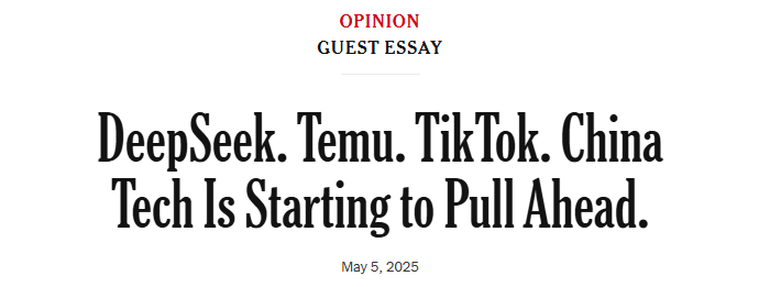 从人工智能大模型DeepSeek、到拼多多海外版……谷歌前首席执行官埃里克·施密特近期在《纽约时报》网站发布的一篇合著的评论文章中称,中国的科技开始处于领先水平。