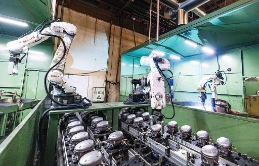 2025年4月,湖北黄石一家企业的智能化生产车间里,机械臂有序运转赶制订单(图自视觉中国)